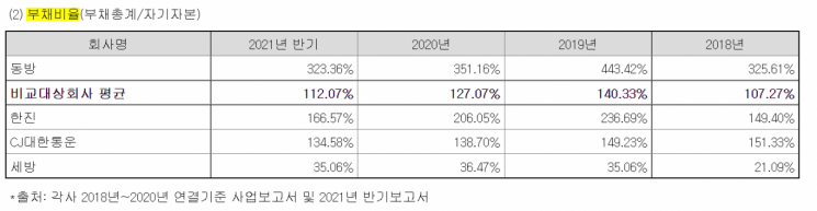 부채비율은 323%로 한진(167%), CJ대한통운(135%), 세방(35%) 등보다 높다. 증자를 마무리한 뒤 높은 금리의 사모사채, 기업어음을 상환하면 부채비율은 242% 수준으로 낮아질 것으로 예상했다.