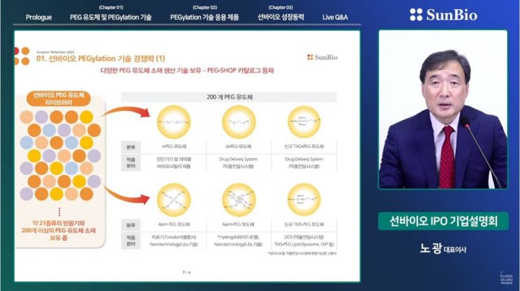 [아시아경제 장효원 기자] 국내 유일 페길레이션(PEGylation) 기술 전문 바이오기업 선바이오(대표이사 노광)가 16일 온라인 기자간담회를 열고 회사 소개와 상장 후 성장 전략을 밝혔다.