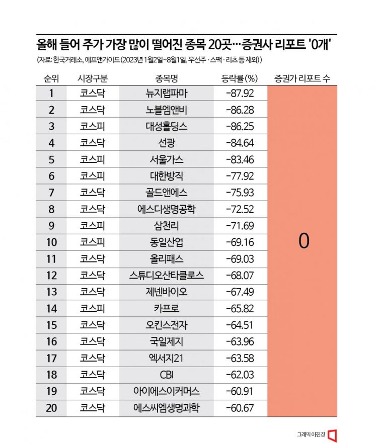 올해 들어 주가가 크게 떨어진 종목 관련 국내 증권사 리서치센터 분석 보고서가 턱없이 부족했던 것으로 나타났다. 수익률이 가장 부진했던 20개 종목은 아예 분석 자체가 이뤄지지 않았다. 시장을 고루 살펴야 할 증권사들이 주가가 떨어지는 종목은 철저히 외면하고 있다는 비판이 나온다.