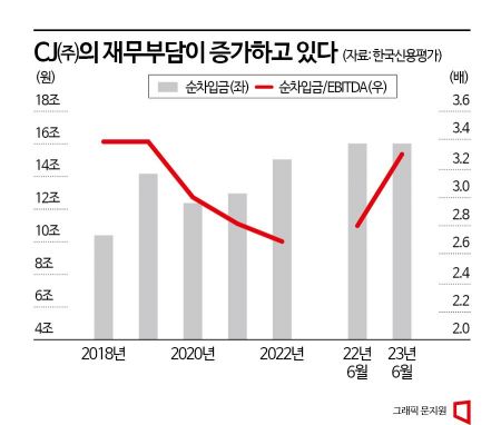 차입금 증가와 실적 저하로 그룹 지주사인 CJ㈜의 연결 기준 EBITDA 대비 순차입금 배수는 지난해 말 2.8배 수준에서 3.8배로 상승했다. 구정원 한신평 선임애널리스트는 "여러 건의 대규모 인수합병(M&A)으로 차입금 규모가 증가한 상황에서 올해도 주요 부문에 대한 투자가 계획돼 있어 투자지출(CAPEX) 규모를 감축하기는 어려워 보인다"면서 "자산 매각 등의 재무개선 노력과 이익창출력 확대 방안을 모색할 필요가 있다"고 말했다.