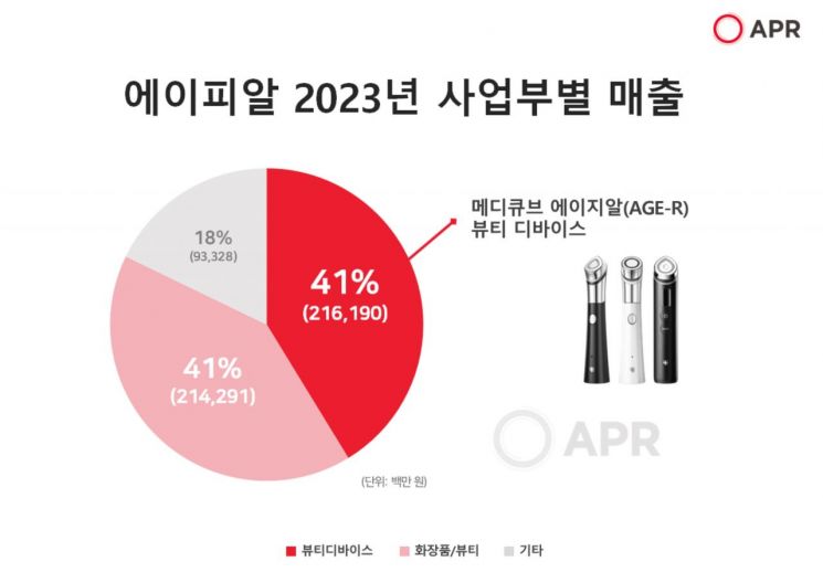 뷰디 디바이스 '메디큐브 에이지알(AGE-R)'이 지난해 실적을 견인했다. 지난해 에이피알의 뷰티 디바이스 판매량은 국내와 해외 시장을 합쳐 약 105만대로 나타났다. 2022년도 판매량이 60만대였던 것을 감안하면 1년새 75% 증가한 셈이다. 지난해 뷰티 디바이스 매출은 2162억원을 기록해 사상 처음으로 2000억원을 넘겼다.