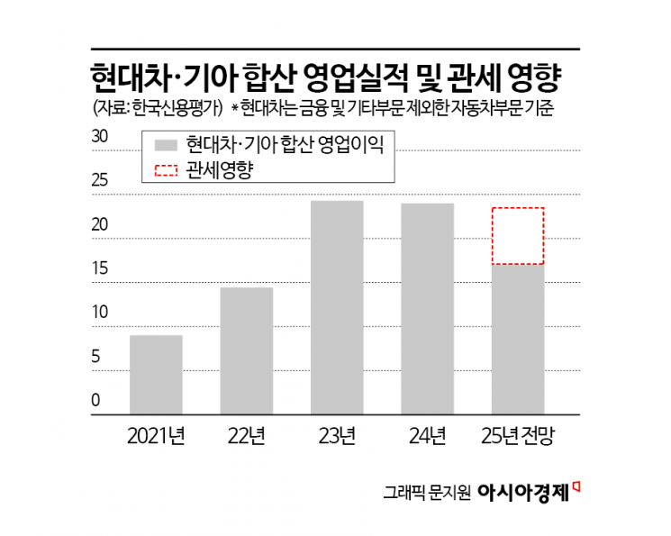 이에 따라 자동차 부문을 기준으로 한 두 회사의 합산 영업이익은 지난해 24조1000억원에서 올해는 관세 영향으로 5조원가량 감소할 것으로 전망됐다. 지난해 현대차그룹이 미국에 판매한 완성차는 총 171만대다.
