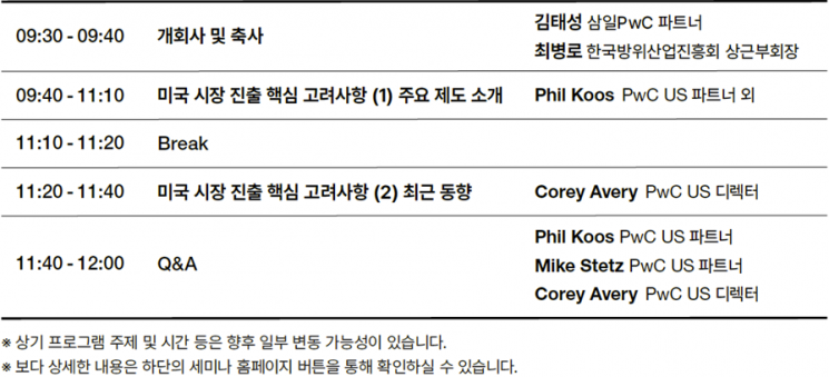 웨비나엔 PwC 미국 소속의 정부계약 전문가들이 직접 참석해 미국 연방조달규정, 원가회계기준, 미국산 우선 구매법(Buy American Act) 및 미국 사이버보안 인증제도(Cybersecurity Maturity Model Certification) 등을 설명하고 대응 방안을 제시한다.