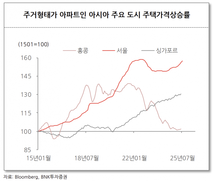 10일 BNK투자증권은 '갑론을박: 관세, 금리 인하, 부동산 중심으로' 보고서를 통해 최근 10년간 서울 아파트 가격 상승률은 주거 형태가 동일한 싱가포르, 홍콩 등에 비해서 상대적으로 높은 수준이며, 특히 강남 아파트값은 싱가포르 핵심지역과 비슷한 수준까지 상승했다고 분석했다.