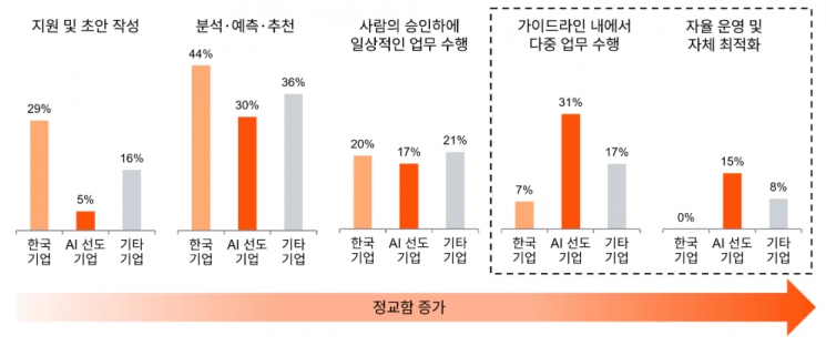하지만 AI 활용의 정교함에서 선도 기업에 가장 뒤처졌다. 한국 기업의 73%는 가장 정교한 AI 활용이 지원·요약·분석·추천에 그쳤다. 자율 운영이나 자체 최적화 수준으로 AI를 보유한 기업은 전무했다. 나머지 기업에 비해 고객 경험 혁신(22%)과 사람의 개입 없는 의사결정(15%) 항목에서도 낮은 성과를 기록했다. 거버넌스 측면에서는 보안(63%)을 제외한 전 항목에서 나머지 기업보다 낮았다.
