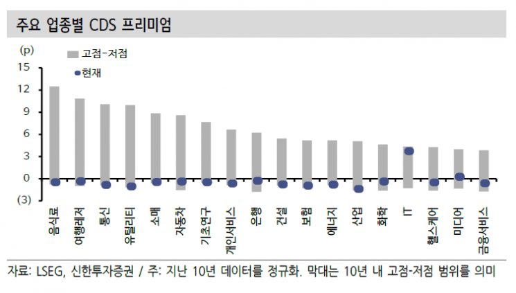 IT 업종의 신용부도스와프(CDS) 프리미엄도 주시할 경계 신호다. CDS 프리미엄은 시장이 체감하는 미래의 공포를 반영하기 때문이다. 신한투자증권이 분석한 결과 지난 10년간 대다수 업종의 CDS 프리미엄은 역사적 평균 부근에 머물러 있으나, 소프트웨어를 포함한 IT 업종은 현재 역사적 고점 부근이라는 설명이다.