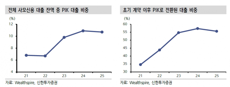 사모대출 시장에서 PIK 비중이 늘어난 점도 우려된다. PIK는 차입자가 현금으로 이자를 내는 대신 그 이자를 대출 원금에 더하는 식이다. 부채를 통해 이자를 막고 있는 상황이 장기화하고 있음을 시사한다. 금리 인하가 늦어질 경우 누적된 이자 부담이 일시에 충격으로 다가올 가능성이 커지고 있다. 이 이코노미스트는 "신용 위험을 자극하는 요인들은 잔재하나, 대형차주들의 상대적 건전성으로 리스크가 가려진 환경으로 보인다"라고 설명했다.